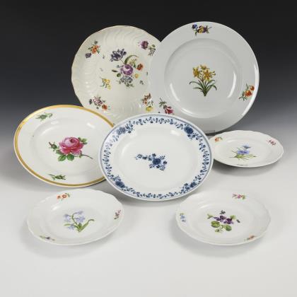 1 Schale und 6 Teller mit Blumenmalerei. Meissen.