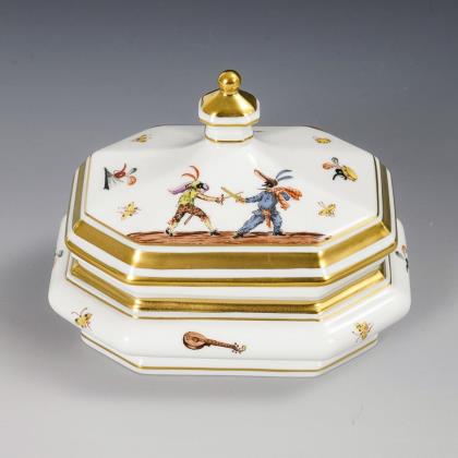 Gedrückt gebauchte, rechteckige Dose mit angeschnittenen Ecken und Knaufdeckel. Allseitig bemalt mit Szenen nach der italienischen Commedia dell'arte und mit Masken und Insekten, nach Radierungen von Jacques Callot (1592-1635)