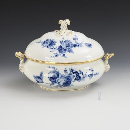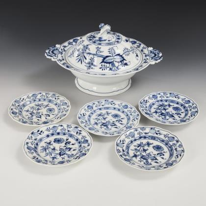 Zwiebelmuster-Deckelschüssel und 5 -Teller. Meissen.