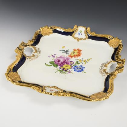 Quadratisches Tablett mit zwei Handhaben, kobaltblauem Teilfond auf der Fahne und goldstaffiertem, teils -bronziertem Rocaillerelief. Im Spiegel ein Blumenbukett mit Rose, Federmohn und Aurikeln