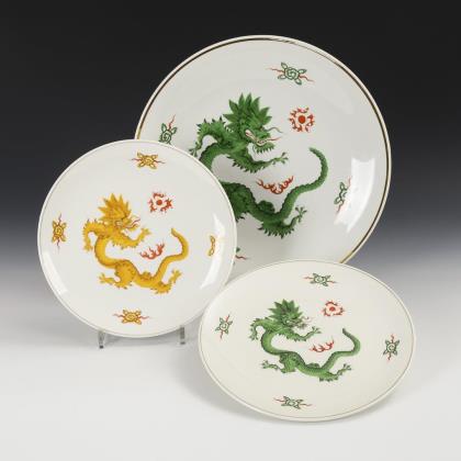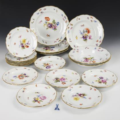 Form "Neuer Ausschnitt". 3 Suppenteller (Ø 23,5 cm), 3 Speiseteller (Ø 25 cm) und 12 Kuchenteller (Ø 17,5 cm)