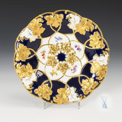 Schale mit Goldbronziertem Eichen- und Weinlaubrelief, Kobaltteilfond und Streublümchenmalerei