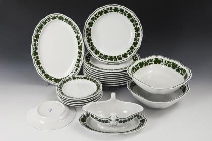 Form "Altozier". 7 Speiseteller, 6 Suppenteller, 6 Kompottschälchen, 1 Deckelschüssel (Ø 28,5 cm), 1 Schüssel (Ø 25,5 cm), 1 Ovalschale (L 19,5 cm), 1 Sauciere (L 20 cm) und 1 Kredenzplatte (28 x 24 cm)