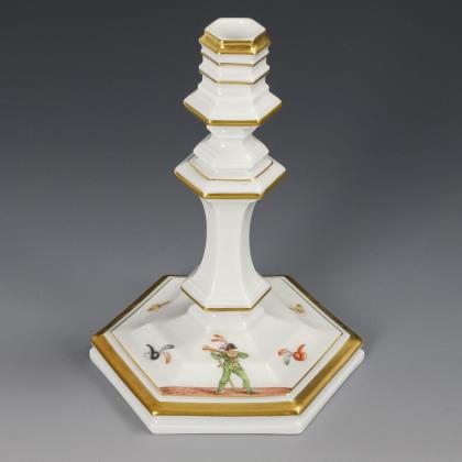Hexagonaler Leuchter mit mehrfach gegliedertem Schaft. Bemalt mit einer Figur nach der italienischen Commedia dell'arte sowie mit Masken und Insekten