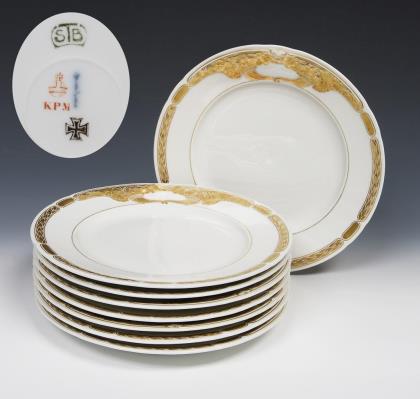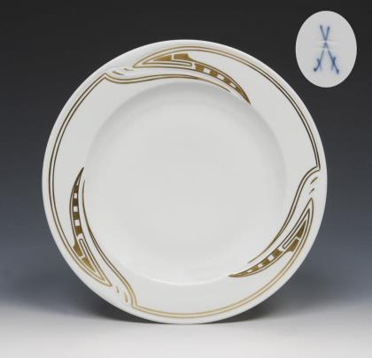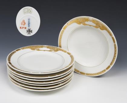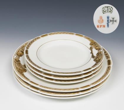 Modell-Jahr: 1912. Das Modell "Ceres" wurde zum 150-jährigen Jubiläum der Manufaktur 1913 geschaffen. 4 Suppenteller, 4 Essteller. Reliefdekor mit Füllhörnern und Ährenkranz, Bemalung in Gold. Pressmarken, Malermarken, grünes Künstler-Signet, blaue Zeptermarken, rote Reichsapfelmarken, schwarze Kriegsmarken