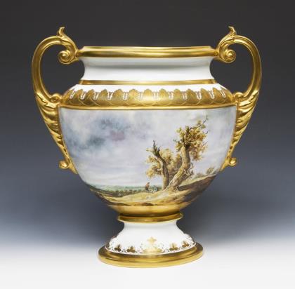 Beidseits großflächige farbige Bemalung, florales Golddekor, Goldstaffage. "Landschaft mit zwei Eichen" nach der Gemäldevorlage von Jan van Goyen (1596-1656, das Original-Gemälde hängt im Rijksmuseum, Amsterdam) und "Schlosspark von Rueil-Malmaison bei Paris" (privater Rückzugsort von Kaiser Napoleon und seiner Frau Joséphine) nach der Gemäldevorlage von Auguste Garnerey (1784-1824). Goldene Bodenmarke, Maler-Signet, schwarze Titel