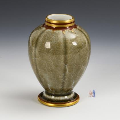 Sechspassige Balustervase mit Rundfuß. Heller Fond mit bräunlicher, unregelmäßig aufgerissener Glasur, an Hals und Fuß rotbraun-goldene Bordüre