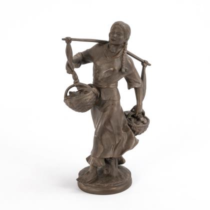 Zwei Obstkörbe mit einem Joch tragende Asiatin