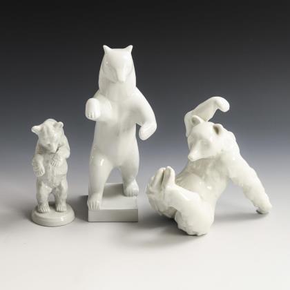 2x KPM BERLIN: stehender Bär (H 25 cm) und sitzender Bär (H 17 cm). / 1x SCHAUBACH, Modell-Nr. 1435: stehender Bär (H 16 cm)
