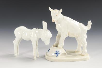 1x Zicklein auf Schüssel, Modell-Nr. V 107, Entwurf 1904 von Erich Hösel (1869-1953) (H 14 cm). / 1x Eselfohlen, Modell-Nr. A 1247, Entwurf 1931 von Willi Münch-Khe (1885-1960) (H 10,5 cm)