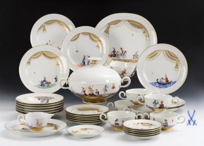 Modell-Jahr: 1912. Das Modell "Ceres" wurde zum 150-jährigen Jubiläum der Manufaktur 1913 geschaffen. 35 Teile: 1 Terrine, 2 große runde Platten, 1 Fischplatte, 1 Speiseplatte, 1 Deckelsauciere, 2 quadratische Schalen, 2 Gewürzgefäße, 1 Servierlöffel, 6 Essteller, 6 Suppenteller, 6 große Dessertteller, 6 kleine Dessertteller. Reliefdekor mit Füllhörnern und Ährenkranz, Bemalung in Gold. Pressmarken, Malermarken, grünes Künstler-Signet, blaue Zeptermarken, rote Reichsapfelmarken, schwarze Kriegsmarken