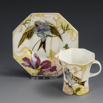 Oktogonale Kratertasse mit Bandhenkel. Auf der Tasse die Darstellung eines Finken zwischen Blumen und vegetabilen Ranken, auf der Untertasse ein mit ausgebreiteten Flügeln auf einem Stängel sitzender Fink