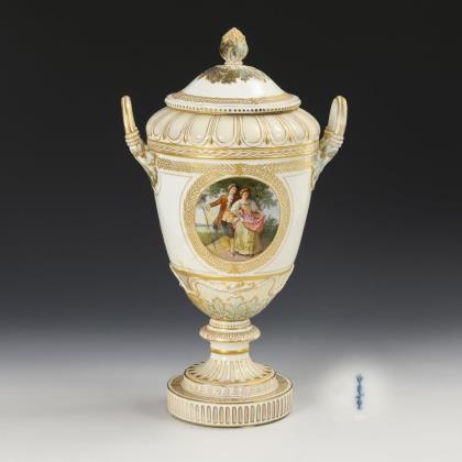 Sogenannte Weimarvase. Ovoider Korpus mit Zungenbandrelief, zwei Akanthusblatthenkeln, Knaufdeckel, kanneliertem Rundfuß, auf Rundplinthe. Schauseitig ein Medaillon mit der Darstellung eines Rokoko-Gärtnerpaares, verso ein Blumenbukett im Stil der Weichmalerei