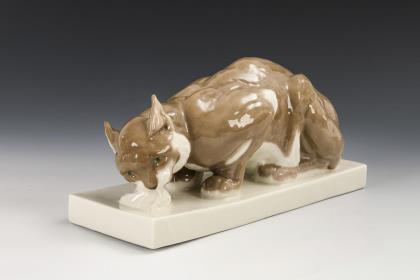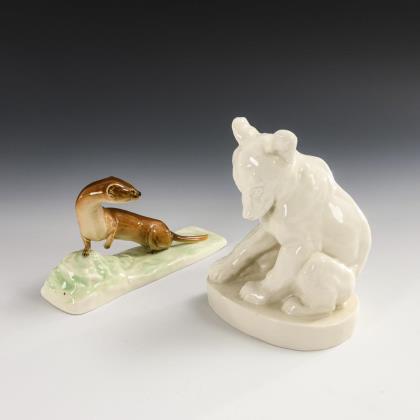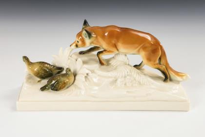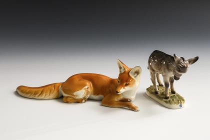 1x Modell-Nr. 481, Entwurf 1910 von Theodor Kärner (1884-1966): liegender Fuchs (L 24,5 cm). / 1x Modell-Nr. 605, Entwurf um 1926 von Pierre Jules Mêne (1810-1879) und August Göhring (1891-1965): stehendes Eselfohlen (H 10 cm)