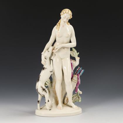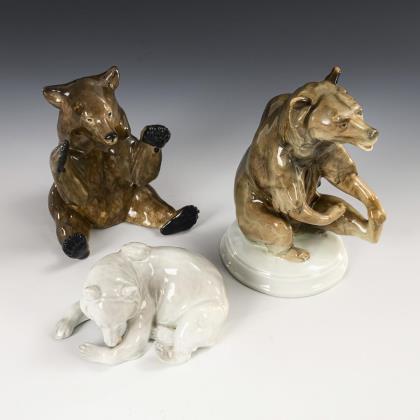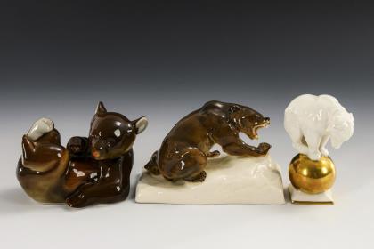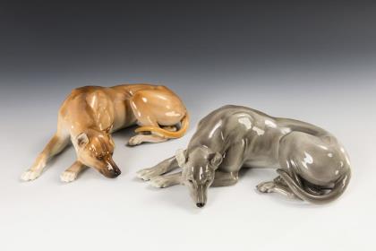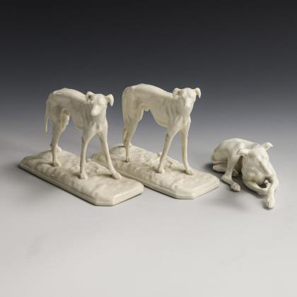 1x Modell-Nr. 186, Entwurf 1906 von Theodor Kärner (1884-1966): einen Fuchs angreifender Dackel (H 6,5 cm, L 28 cm). / 1x Modell-Nr. 250, Entwurf 1907 von T. Kärner: liegender, einen Frosch betrachtender Jagdhund (H 8 cm). / 1x Modell-Nr. 720 (lt. Verzeichnis 760), Entwurf 1932 von Pierre Jules Mêne (1810-1879): Windspielgruppe (H 13,5 cm)
