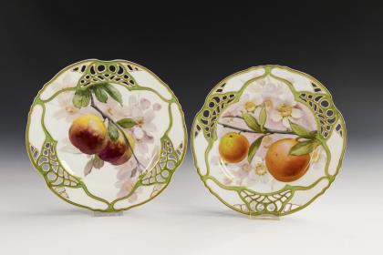 Dessertteller mit partiell durchbrochener Fahne, im Spiegel jeweils die Darstellung eines Pfirsichzweiges bzw. Aprikosenzweiges