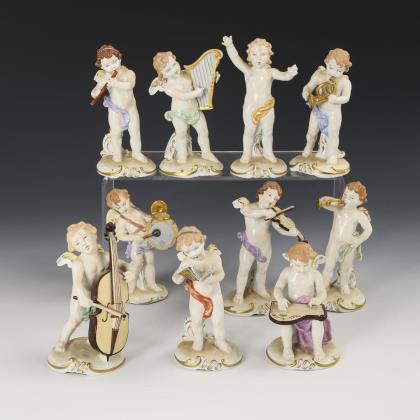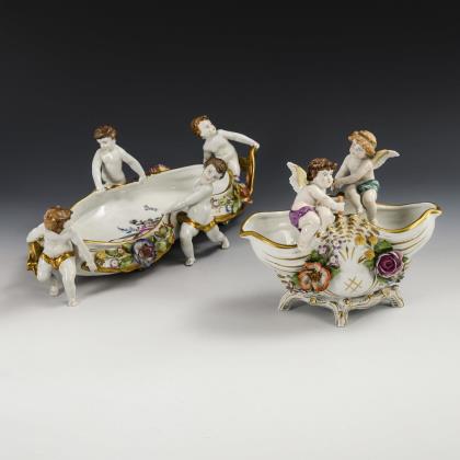 1x von vier Putten getragene, reich mit Blüten belegte Ovalschale (L 46,5 cm). / 1x ovale Muschelschale mit Blütenbelag und zwei auf dem Rand sitzenden Putten (L 22,5 cm, H 19 cm)