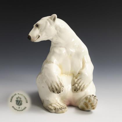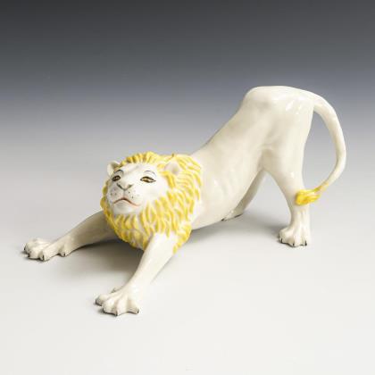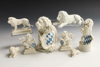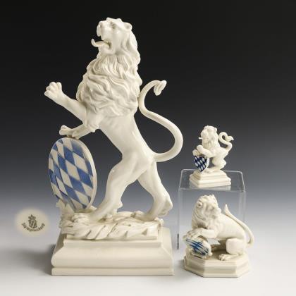 6x NYMPHENBURG: 4 verschiedene Löwen mit bayerischem Wappen (H 8,5-16 cm), 2 liegende Löwen (L 6 und 7,5 cm). / 2x ROSENTHAL: Löwe auf Rechtecksockel (H 8 cm) und liegender Biskuitlöwe (L 17,5 cm)