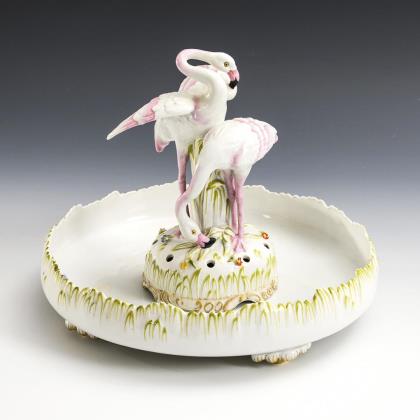 Flache Schale mit vier Rocaillefüßchen und auf einem gewölbten Sockel stehendes Flamingopaar, der Sockel durchbrochen zum Einstecken von Blumen