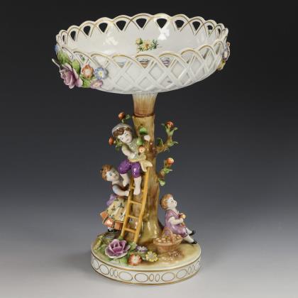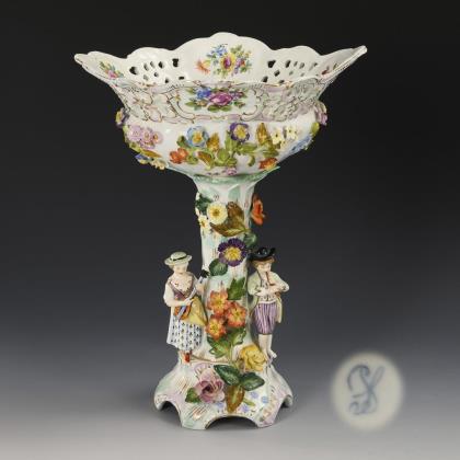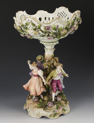 Blütenbelegte und rocaillereliefierte Durchbruchschale, auf Baumstammschaft mit vier, einen Reigen tanzenden Frauen und Männern, blütenbelegter Rocaillesockel