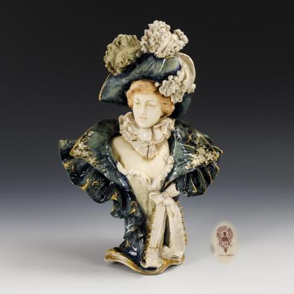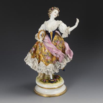 Auf einem blütenbelegten Sockel im Tanzschritt stehende Rokokotänzerin mit spitzenbesetztem Kleid und Tamburin