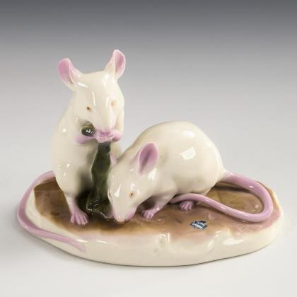 Zwei auf einem Natursockel sitzende, Grünes fressende Mäuse