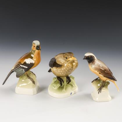 1x Modell-Nr. 458, Entwurf 1909 von Christian Wittmann (1871-1958): Amselküken (H 11,5 cm). / 1x Modell-Nr. 383, Entwurf 1913 von Theodor Kärner (1884-1966): Buchfink (H 14 cm). / 1x Modell-Nr. 323, Entwurf 1911 von Theodor Kärner: Gartenrotschwanz (H 11,5 cm)