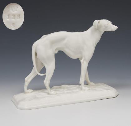 2x Modell-Nr. 128: je auf einem Natursockel stehender Windhund (H 11 cm). / 1x Modell-Nr. 263, Entwurf von Pierre Jules Mêne (1810-1879): liegender Windhund (H 6 cm)