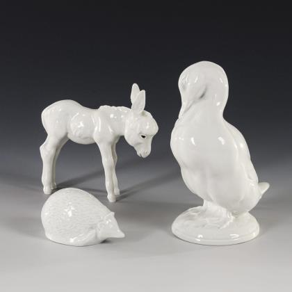 1x Ente: Modell-Nr. S 211, Entwurf 1951 von Erich Oehme (1889-1970), bezeichnet(H 14 cm). / 1x Eselfohlen: Modell-Nr. 1247, Entwurf 1931 von Willi Münch-Khe (1885-1960) (H 10,5 cm). / 1x Igel: Modell-Nr. Q 265, Entwurf 1941 von Erich Oehme, bezeichnet (L 7,5 cm)