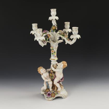 5-flammiger, blütenbelegter Leuchter mit zwei am Schaft stehenden Putten