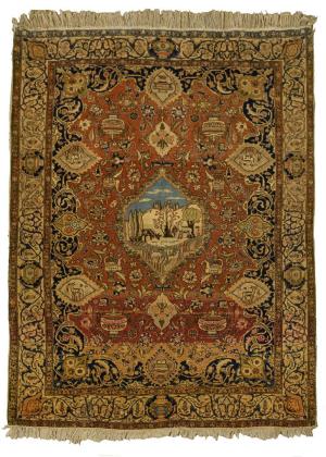 Rotgrundiges Mittelfeld mit einem zentralen Bildmedaillon mit Tieren in einer Landschaft, umgeben von Blumenranken, Vasen und Kannen, umlaufende nachtblaue Borte mit Motivkartuschen. Dreireihige elfenbeinfarbige Bordüre mit Blumen- und Blattranken. Verso eine Schmalseite mit aufgenähter Verstärkung, Fransenabschlüsse