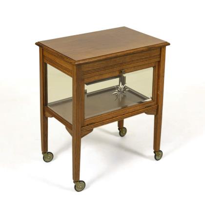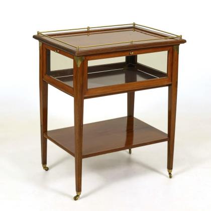 Teewagen mit 4-seitig verglastem Vitrinenkorpus und zu allen Seiten zu öffnenden Vitrinenklappen mit Messingknäufen, obere Ablagefläche mit leichter Vertiefung und umlaufendem Messinggeländer, Zwischenablage, auf 4 konischen Vierkantbeinen mit Rollfüßen. Messingbeschläge