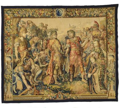 Feine Bildwirkerei mit historisierender, vielfiguriger Antikenszene. Im Zentrum zwei lorbeerbekränzte Heerführer beim symbolischen Handschlag, wohl der junge makedonische König Alexander der Große und der persische Großkönig Dareios III., umgeben von Soldaten, Pferden und Frauenfiguren. Im Hintergrund eine Schiffsflotte und die Ansicht einer Küstenstadt mit vorgelagertem Heer. Bordüre mit üppigem Früchtedekor, Vögeln und Postamenten mit Frauenfiguren