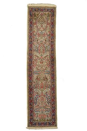 In hellen, kräftigen Farben kolorierter Floralmusterteppich mit geschweiftem Mihrab und zentralem Lebensbaummotiv mit herauswachsenden, bunten Blütenzweigen, dazwischen verschiedenartige Vögel. Bordüre mit Blumenranken. Fransenabschlüsse