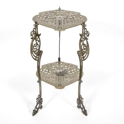 Stiltypisch gestalteter, 2-etagiger Beistelltisch mit geschweiften, teils durchbrochenen Ablageflächen, eingefasst in 3 geschwungene Stützen