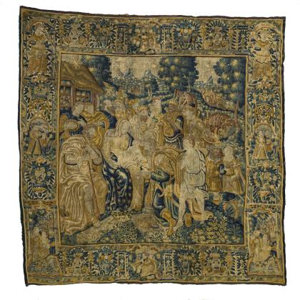 Flämische Tapisserie mit der Anbetung der Heiligen drei Könige.