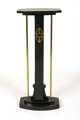 Deckplatte und Sockel mit bombierten, getreppten Rechteckplatten, Vierkantschaft mit flankierenden Messingstäben und Messingornamentbeschlag, sockelseitig angefügte Schnitzelemente