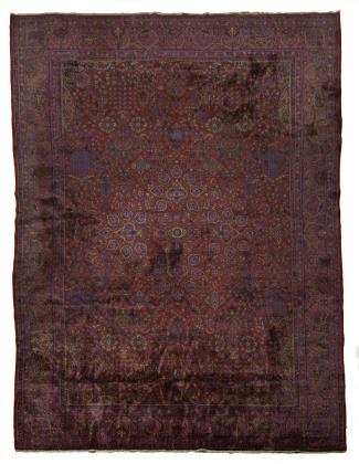 Allover gemustertes Mittelfeld mit sich regelmäßig wiederholendem üppigen Floraldekor aus Blüten, Blumenzweigen und Lebensbäumen. Mehrreihige Bordüre mit alternierenden Kartuschen mit Vasenmotiven und Lebensbäumen. Fransenabschlüsse