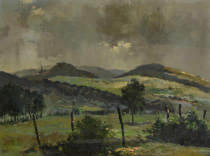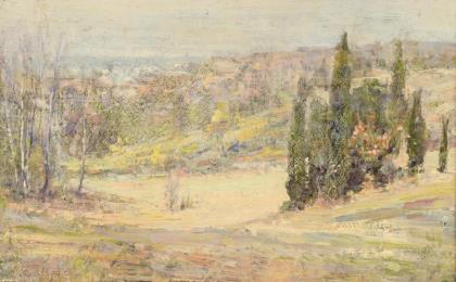 Impressionistisch gemalte Berggegend mit vereinzelten Baumgruppen vor einer Stadt im hellen Sonnenschein