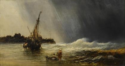 HAYES, Edwin (1819 Bristol - 1904). Fischerboot bei Sturm am Strand.