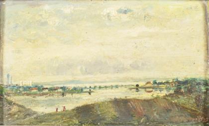 KRÜGER, Carl Max (1834 Lübbenau - 1880 Dresden). Weite Landschaft mit Katen und Staffage.