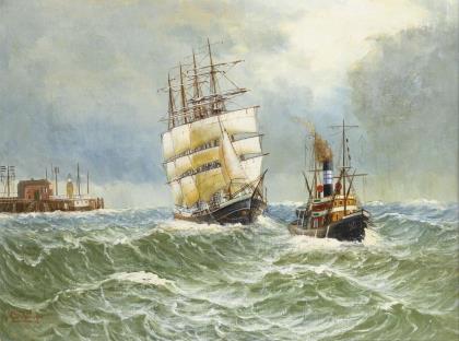 Dampfschiff und Viermaster nahe dem Hafen unter wolkigem Himmel