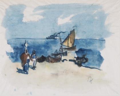 Südliches Strandleben, typisch für den Künstler in skizzenhafter, teils in Nass-in-Nass-Technik ausgeführtes Motiv. Passepartout, verglaster Profilrahmen