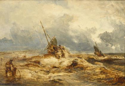 ACHENBACH, Andreas (1815 Kassel - 1910 Düsseldorf). Studie mit Fischerbooten in starker Brandung.