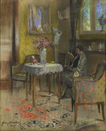 HUTH, Franz (1876 Pößneck - 1970 Weimar). "Zimmerinterieur mit lesender Dame".
