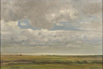 Staffagefiguren vor der Kate mit Blick in die Ebene unter leicht bedecktem Himmel