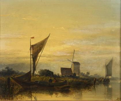HILVERDINK, Johannes (1813 Groningen - 1902 Amsterdam). Fischerboote vor Windmühle.