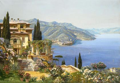 Blick vom Berg über die detailliert gemalte Ortschaft am See im warmen Sonnenschein