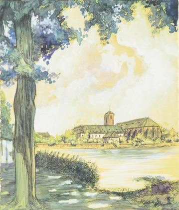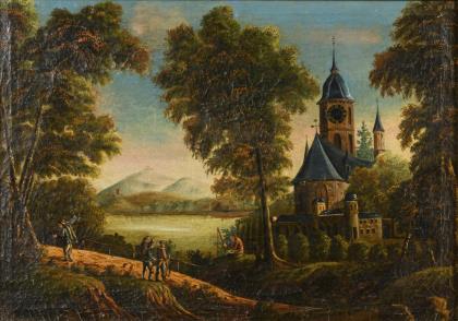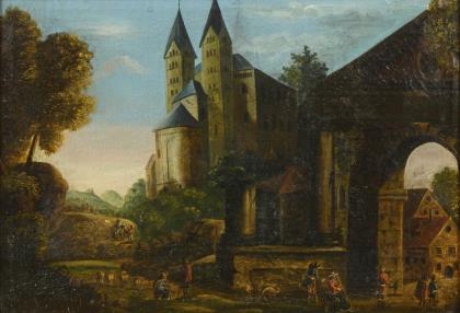 Hügelige Landschaft mit romanischem Dom oberhalb einer Stadt mit Staffagefiguren am Fluss