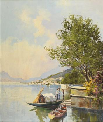 Fein gemalter spätsommerlicher Landschaftsausschnitt mit tiefem Horizont, Figuren- und Bootstaffage. Originaler Keilrahmen, neuwertiger profilierter Goldrahmen